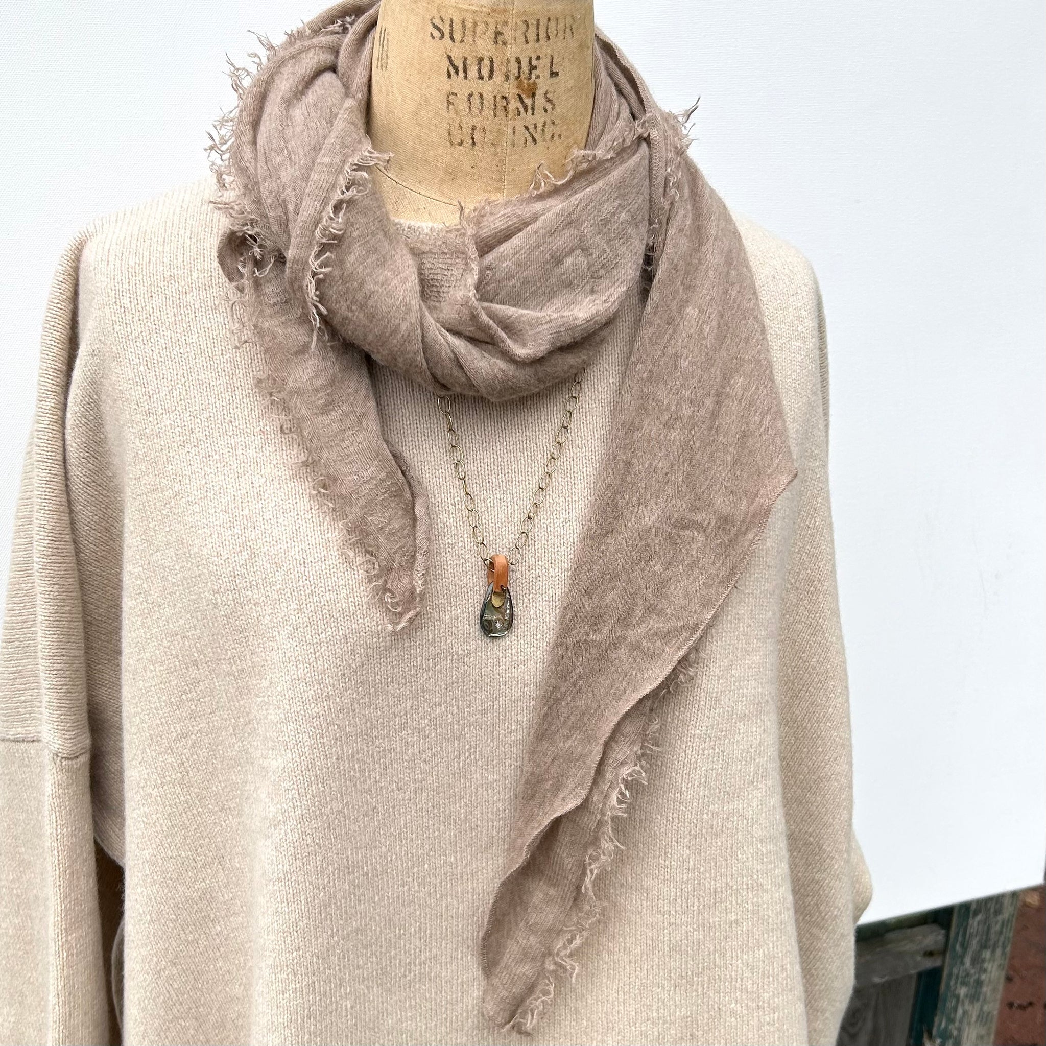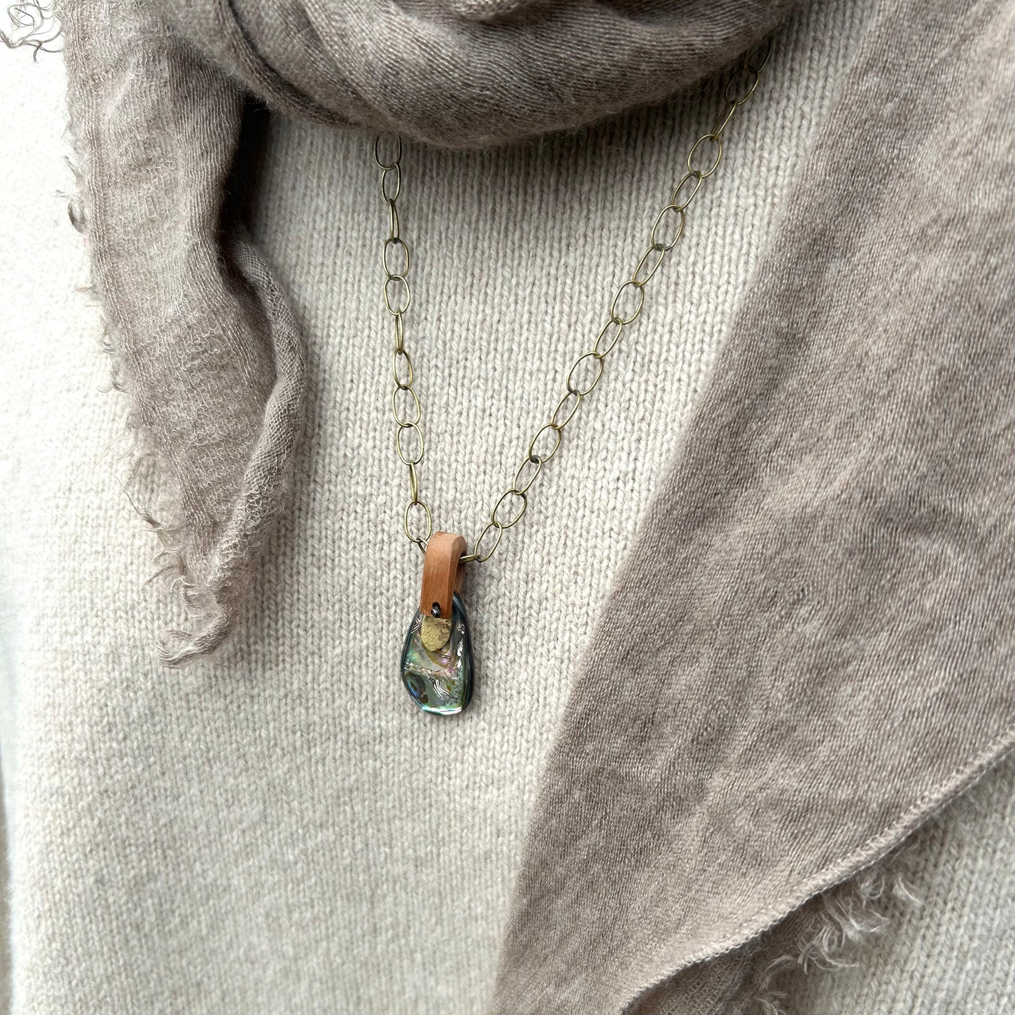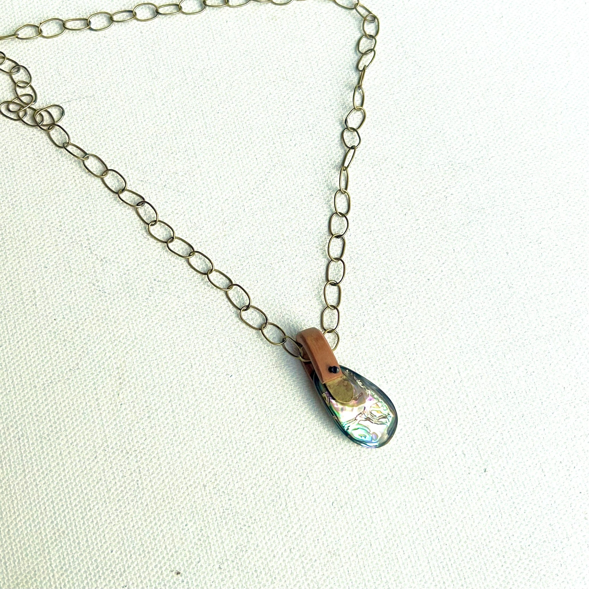 A luminous piece of abalone, set in hand carved wood on a brass chain.  This necklace is 24" long, but can be hooked shorter.
