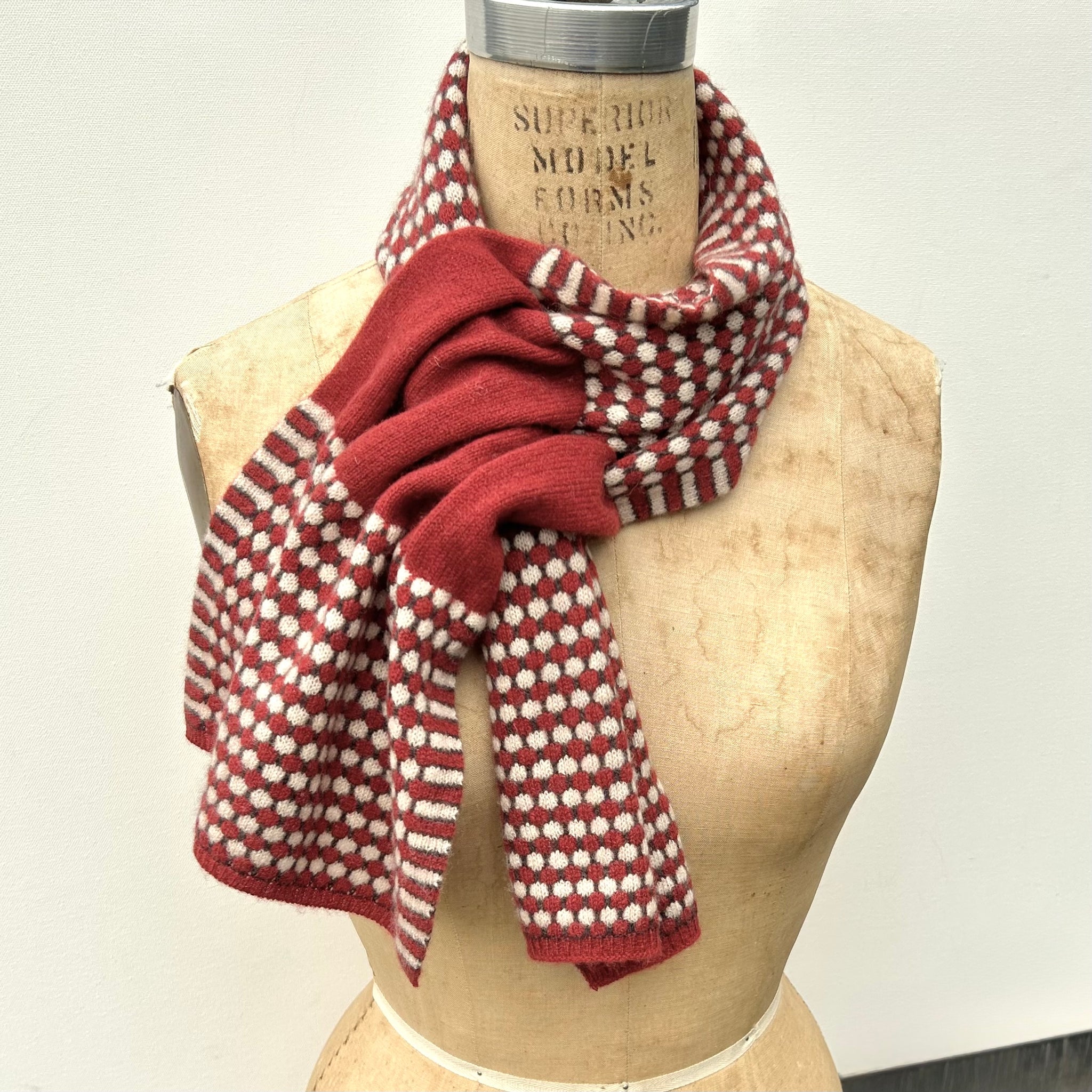 This scarf is a great design, with built-in pass-through, which you can use or not! Brick color with off white dot pattern. Soft and fluffy cashmere, this is a great medium sized scarf, 12" by 42".