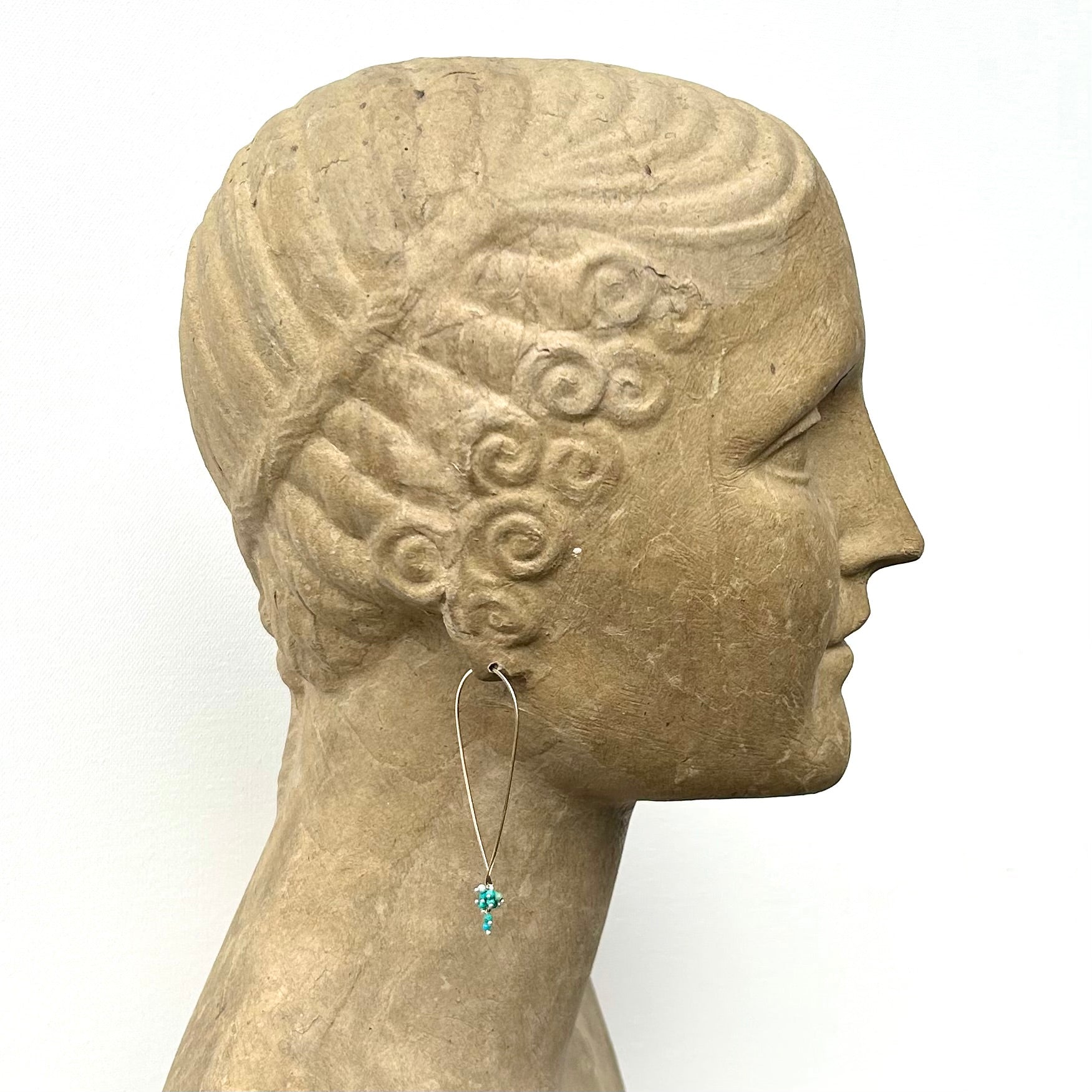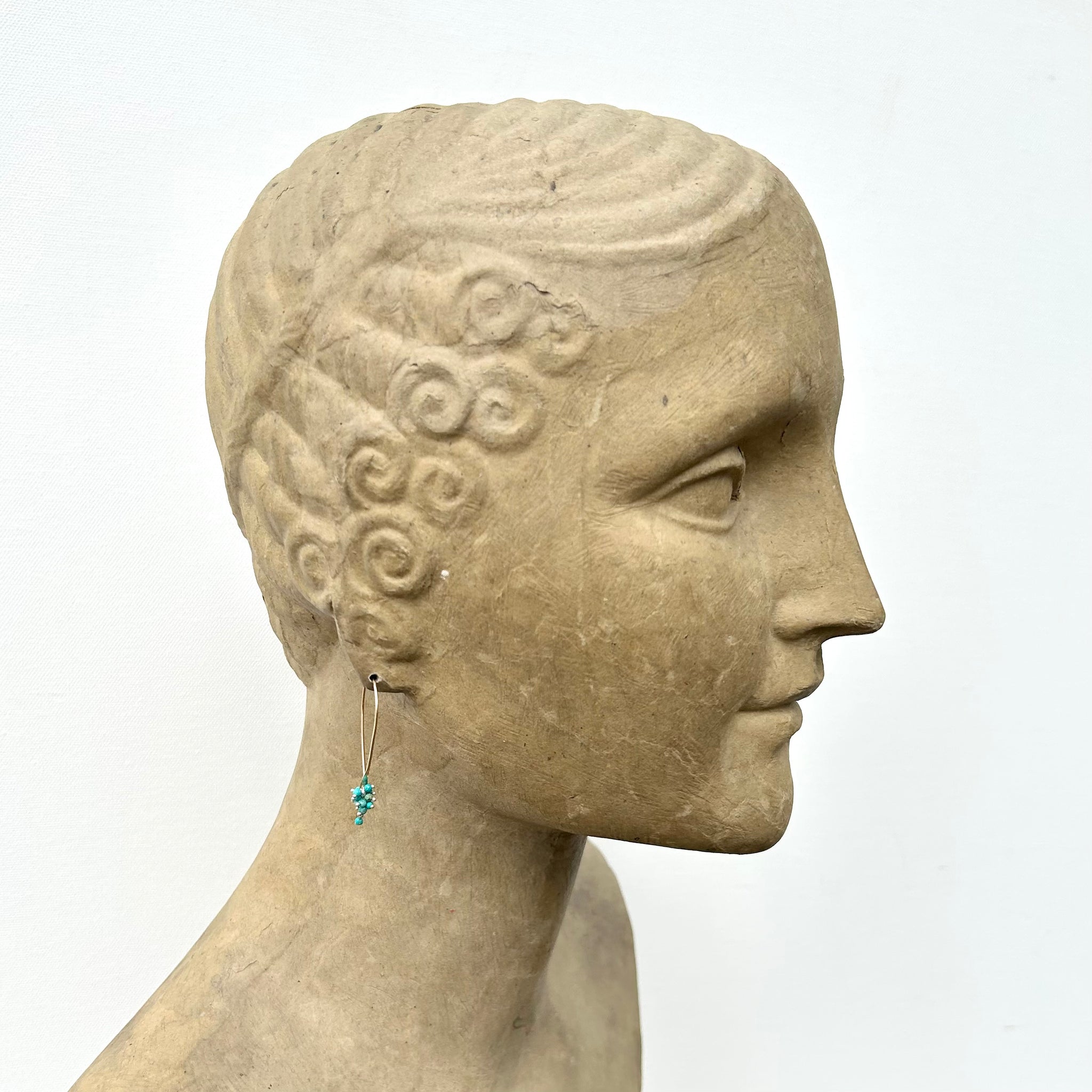 A delicate cluster of stones hanging on a gold filled loop. These earrings are lightweight and have a nice touch of color with a cluster of lapis or turquoise stones. Bigger loops are 2.5" long. Smaller loops are 1.5" long.