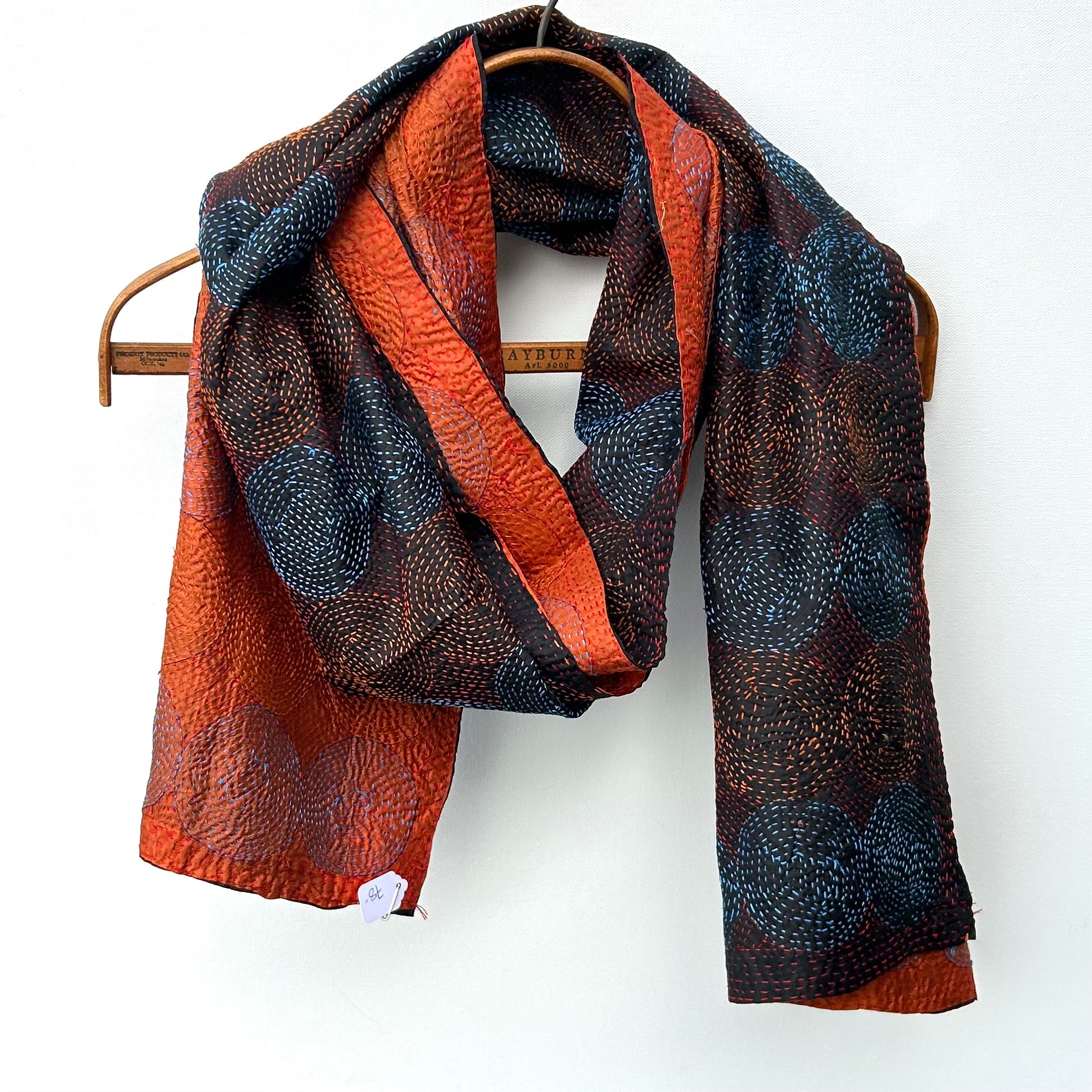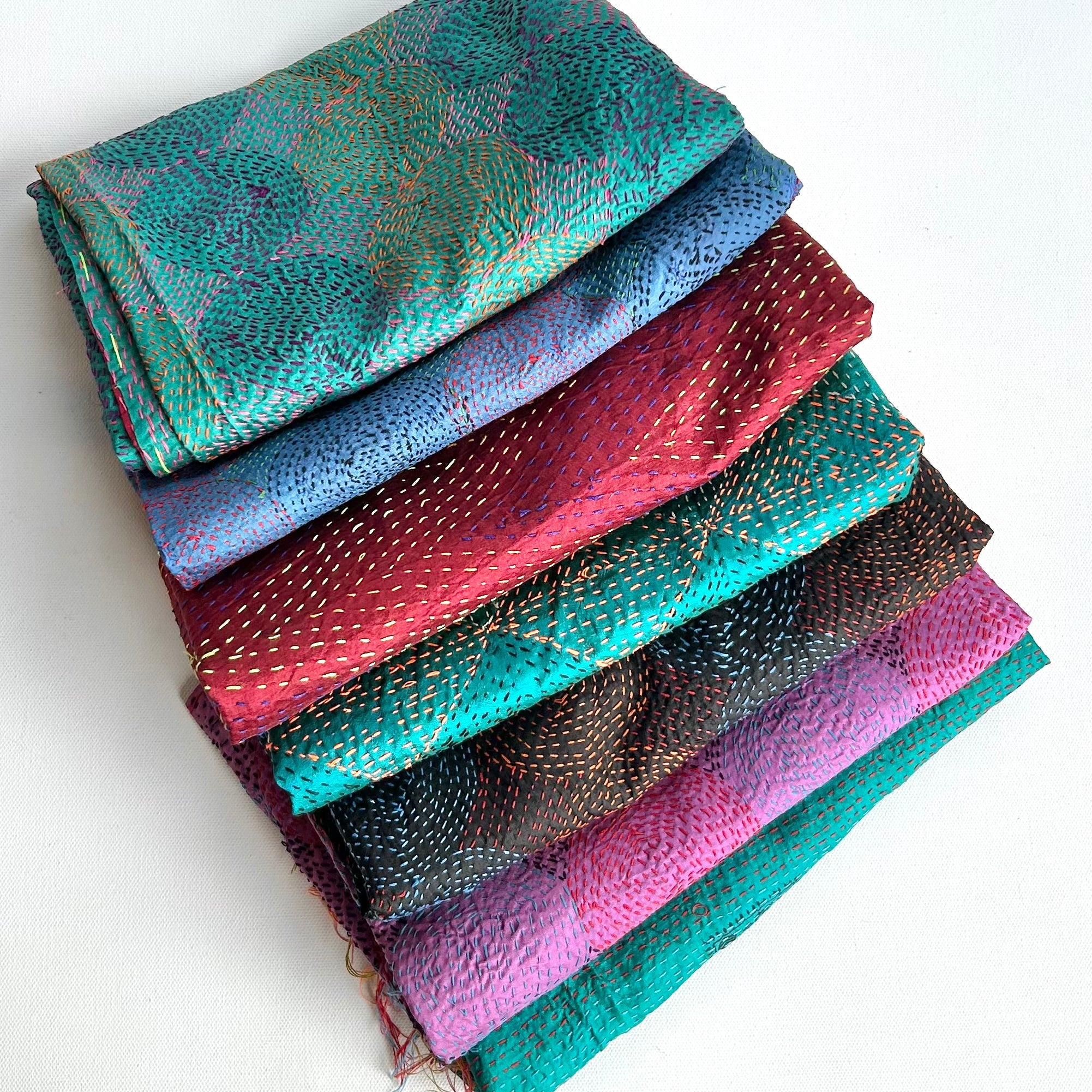 Kantha scarves are lightweight and warm. Made from vintage silk saris, each one is unique.