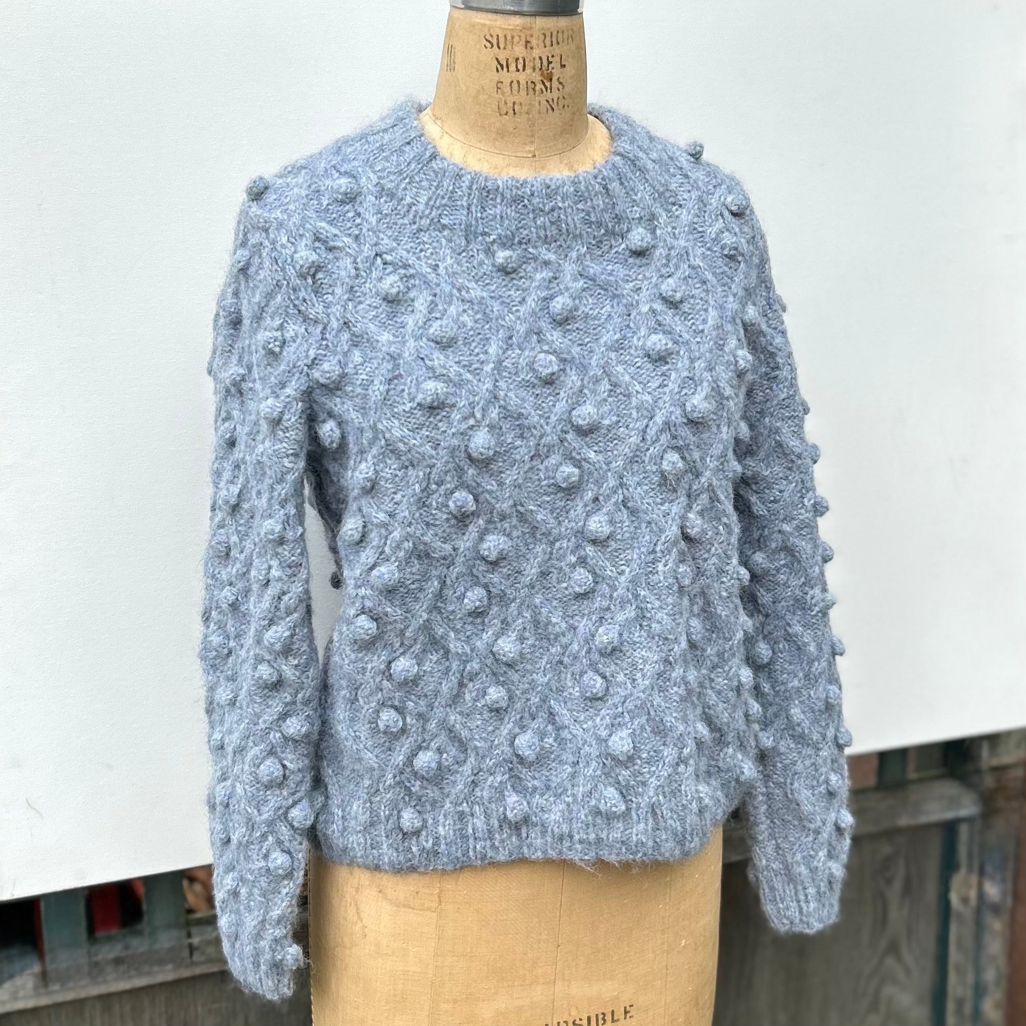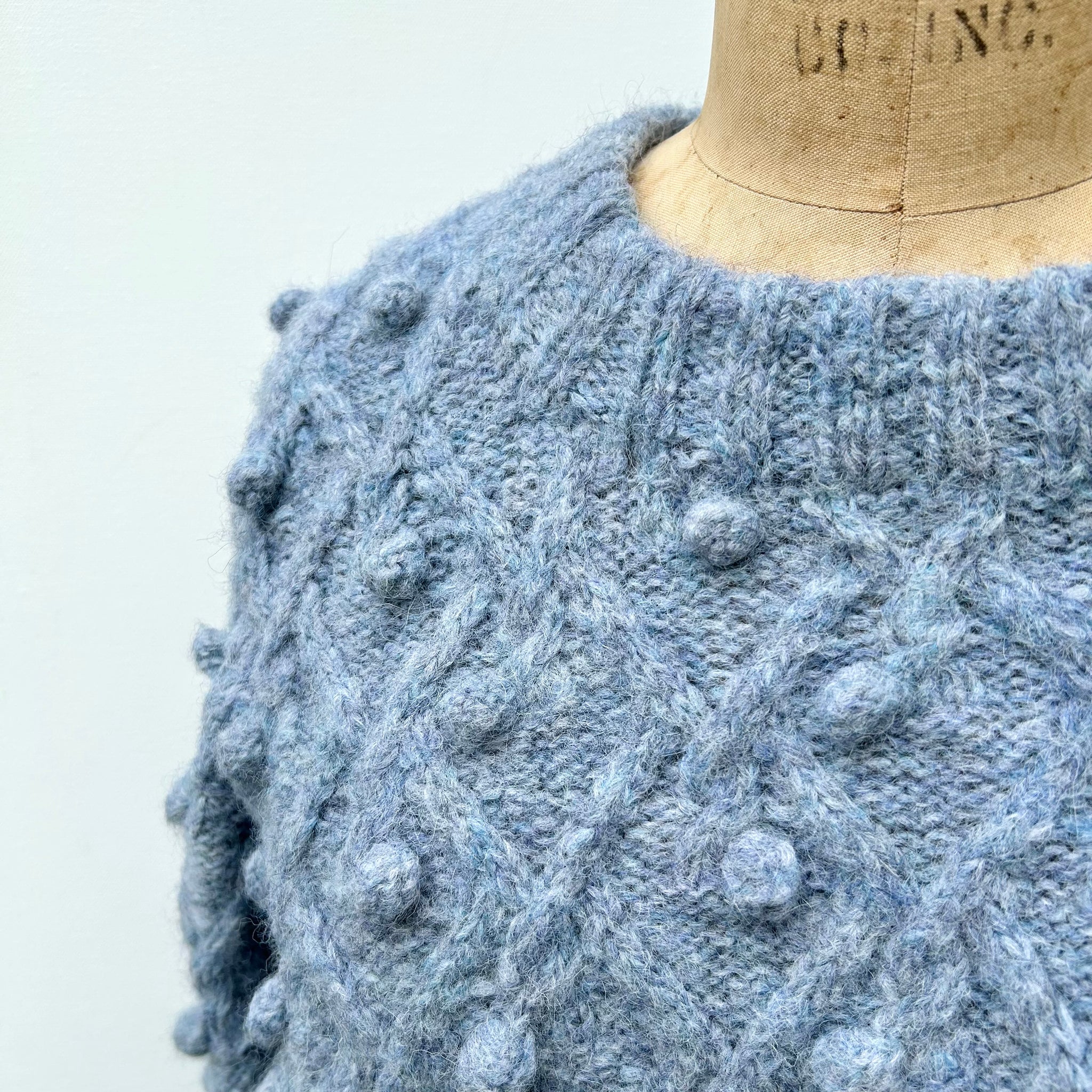 Cozy ice blue sweater is hand knit in Peru. When laid out flat measures approximately 18” across and is 21” long. Yarn is 89% alpaca, 11% polyamide. This sweater is one size, fits best size 4-8.