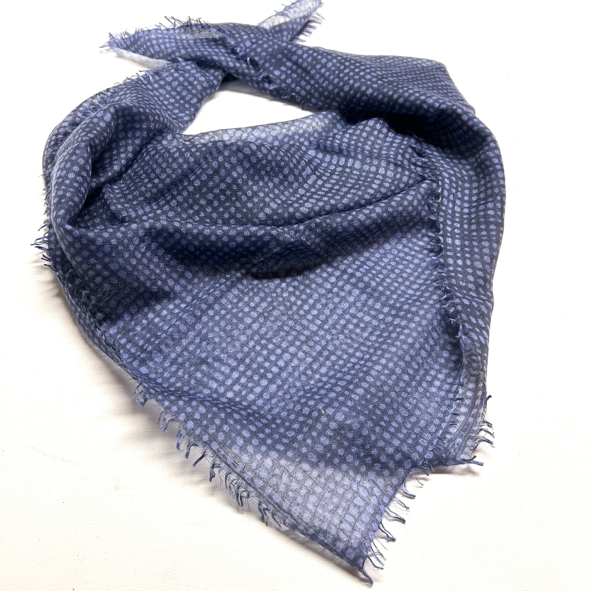 Very delicate cashmere bandana, 28" square, with subtle dotty print.  A whisper of warmth around your neck.